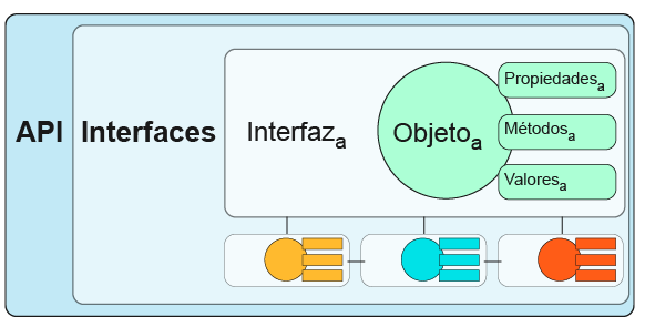 Así mismo, cada gran interfaz de una API puede contener sus propias interfaces. Y con ellas construir objetos base que serán personalizados desde las propiedades, métodos y valores de ese objeto e interfaz (diagrama abajo). Aclaro que el término objeto lo aplico aquí en el contexto de los lenguajes de programación; donde un objeto es una representación de una entidad abstracta y que puede ser alterada para ejecutar resultados desde los datos ingresados mediante código.
