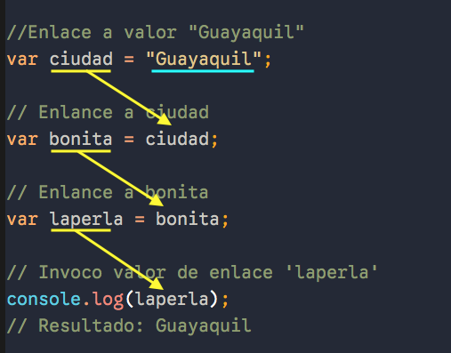 En este contexto, enlazar tiene el mismo significado que alojar un dato para luego recuperarlo, o de guardarlo en memoria para luego accederlo. Como veremos más adelante, muchos lenguajes de programación (como Javascript) cuentan con palabras clave que permiten esos enlaces o alojamiento de datos.